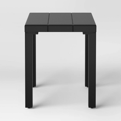 Bring a touch of elegance and functionality to your outdoor space with this Beech Faux Slats Patio Accent Table from Threshold™. The patio accent table features a square shape with a spacious faux-slatted top for resting your drinks, books and other items. The rust- and UV-resistant all-weather construction promotes lasting outdoor use no matter the season, and the matte black color will pair well with any existing patio decor.