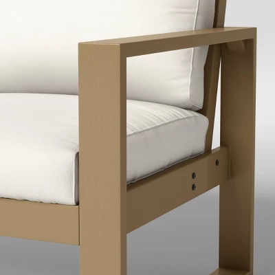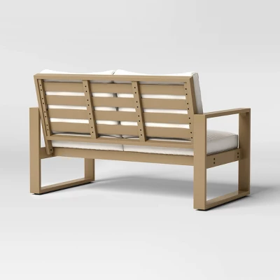 Enjoy relaxing moments with a loved one by sitting on the Esker Outdoor Patio Loveseat from Threshold™. Designed with a wooden frame, this outdoor loveseat features neutral-shade upholstery to complement a variety of porch or patio decor. It boasts a weather-resistant design to help you enjoy all the seasons outdoors in comfort, and you can add a coordinating slatted table to create a perfect sitting arrangement for two or pair it with extra seats to accommodate other family members or guests.