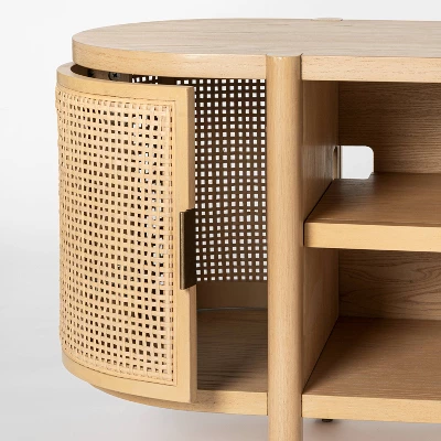 Introduce some appealing retro style to your living room when you add the Portola Hills Caned-Door TV Stand from Threshold™ designed with Studio McGee. This beautiful TV stand features a hardwood frame in a lovely finish, but the real interest comes from a pair of curved cabinet doors finished with cane inserts on either end of the cabinet. Round legs and an oval top carry the smooth shape through the whole piece, while two central shelves let you display your favorite accent pieces even as you keep odds and ends out of sight in the cabinets. Perfect for TVs up to 60 inches, this TV stand is sure to be a decor update you’ll love for years to come.