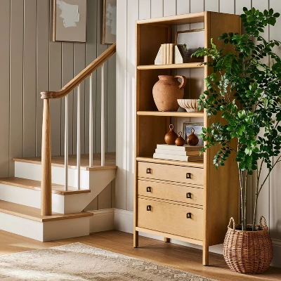The Sandpoint Bookcase with Drawers from Threshold™ designed with Studio McGee blends style and function to upgrade any space in your home. Made from MDF with a wood frame in a natural hue, this bookcase pairs easily with a variety of other decor. It’s designed with three open-back shelves plus three drawers with brass-finish pull knobs, giving you plenty of space for storage and display, and the anti-tip anchoring hardware gives you some extra peace of mind.