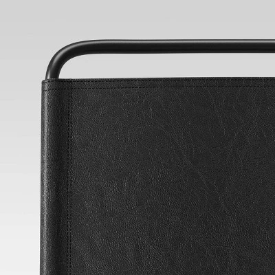 Bring a touch of delightful, distinctive seating style to your kitchen island or home bar with this Ward Faux Leather Sling Metal Counter Height Barstool from Threshold™. Crafted with a sleek metal frame finished in a solid black hue for versatile style, this counter bar stool features a faux-leather upholstered seat and back that seamlessly integrate with your existing decor. The stylish sling back offers extra comfort, coupled with the footrest for an all-around comfy seating experience. Add casual comfort to your home decor with this armless upholstered barstool.